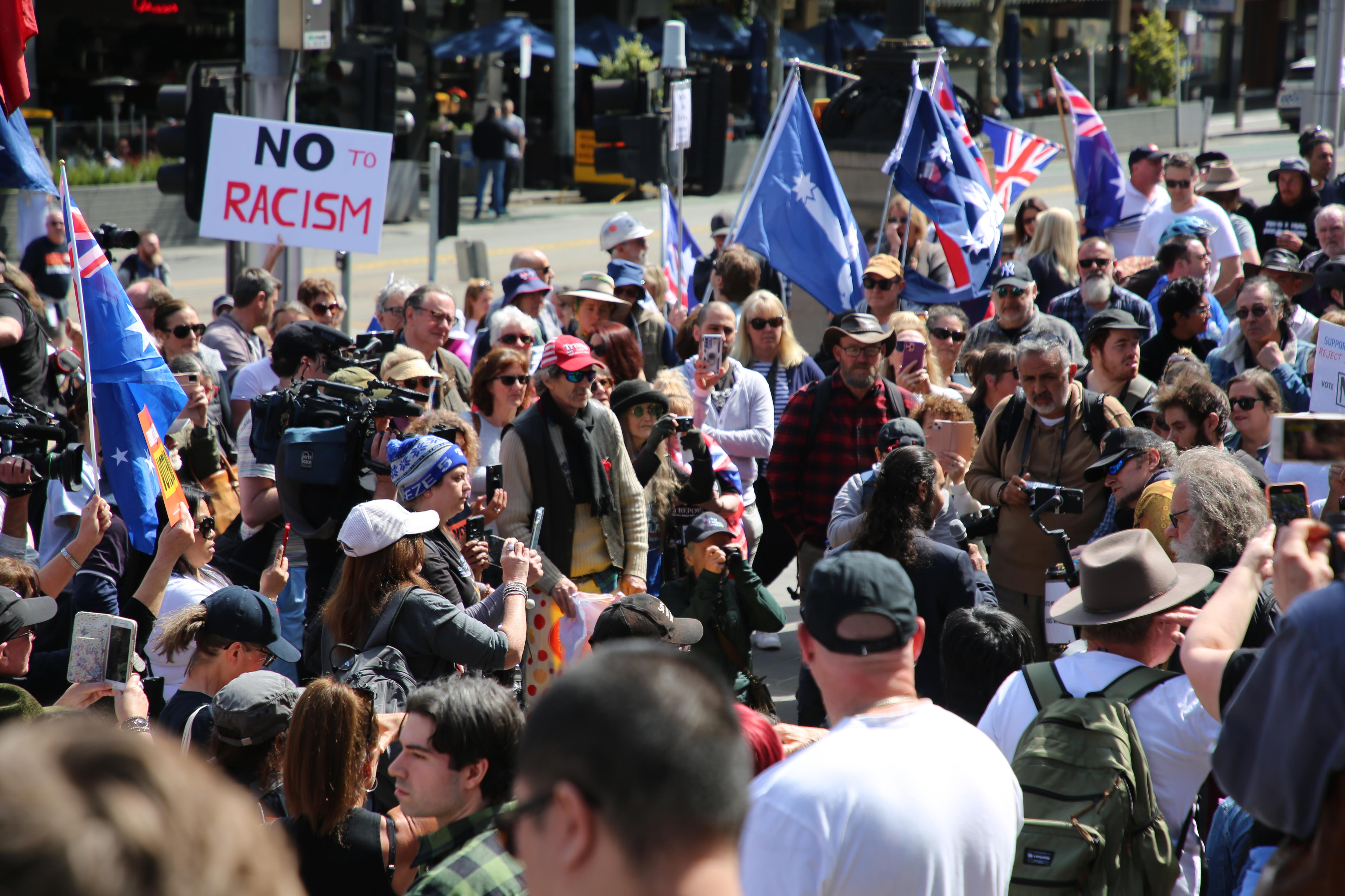 Signs advocating for an activist organisation originally founded in response to COVID-19 pandemic restrictions were prominent at the Melbourne rally, with activists appearing to co-opt a regularly scheduled worldwide demonstration to campaign for the No vote.