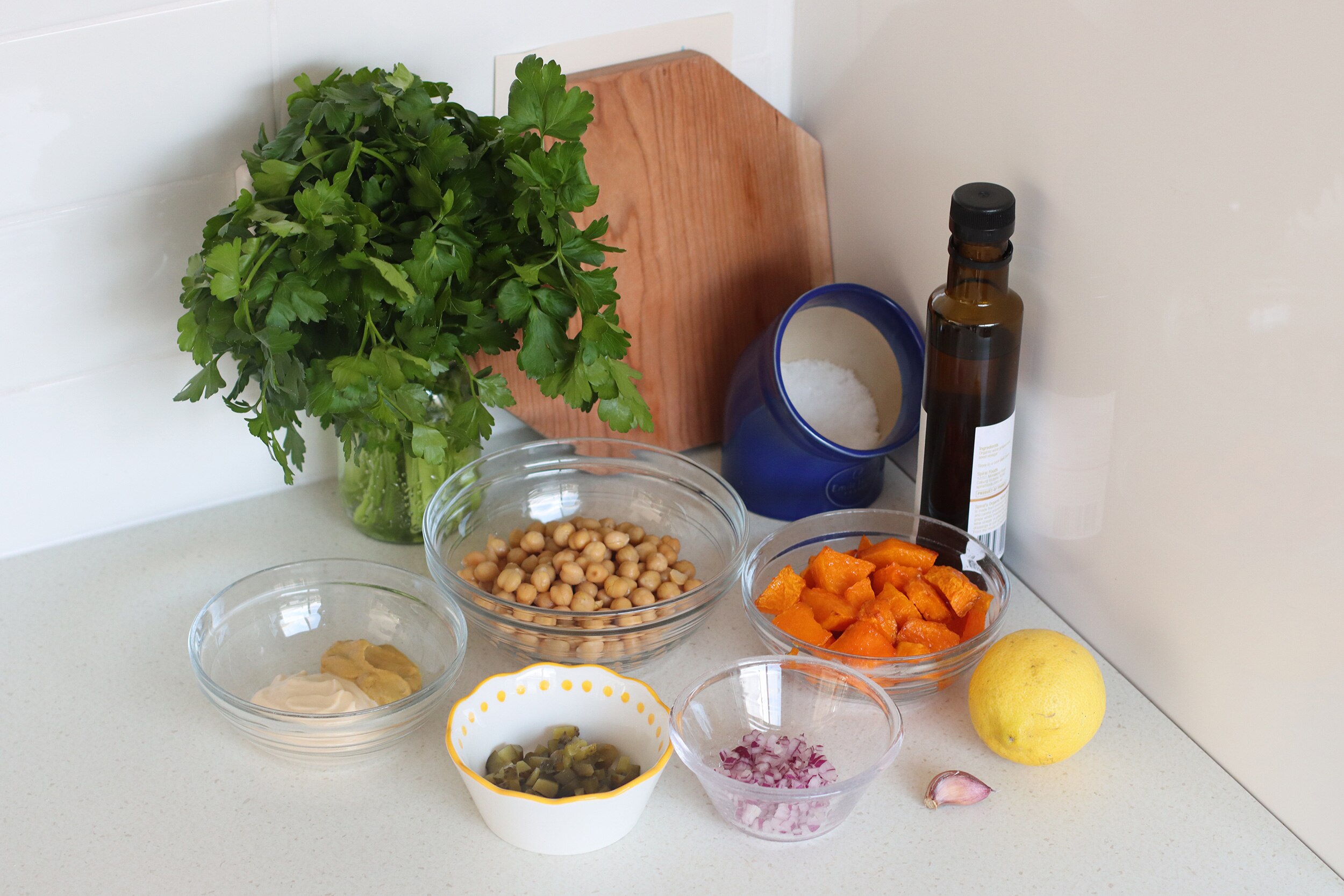 - 3.Add the mayonnaise, mustard and a little cracked pepper and stir well. Fold in the gherkins, followed by the pumpkin. Taste and add more lemon juice, salt and/or pepper as desired. Top with parsley and serve in wraps or sandwiches with whatever spreads and additional ingredients you fancy. Store leftovers in an airtight container for 2–3 days.